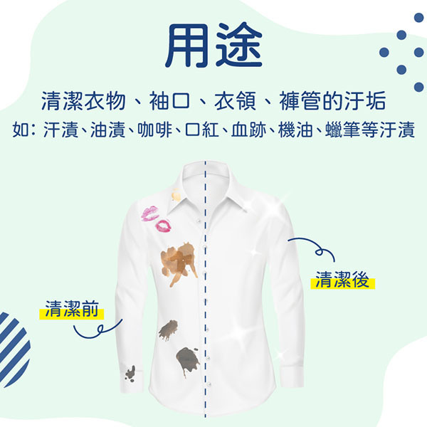用途:清潔衣物、袖口、衣領、褲管的污垢,如:汗漬、油漬、咖啡、口紅、血跡、機油、蠟筆等污漬。