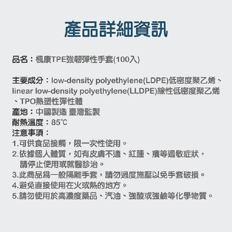 成分:低密度聚乙烯low-density polyethylene(LDPE)、線性低密度聚乙烯linear low-density polyethylene(LLDPE)、TPO熱塑性彈性體