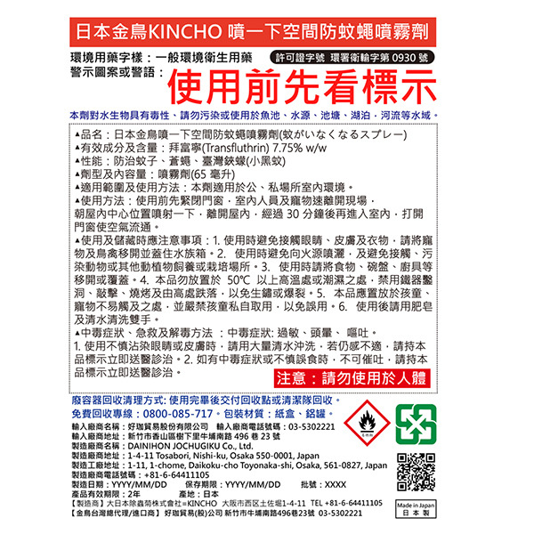 | 環境用藥許可證字號:許可證字號:環署衛輸字第0930號 | ||||||